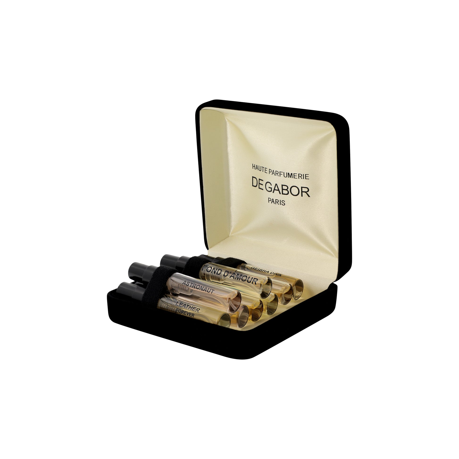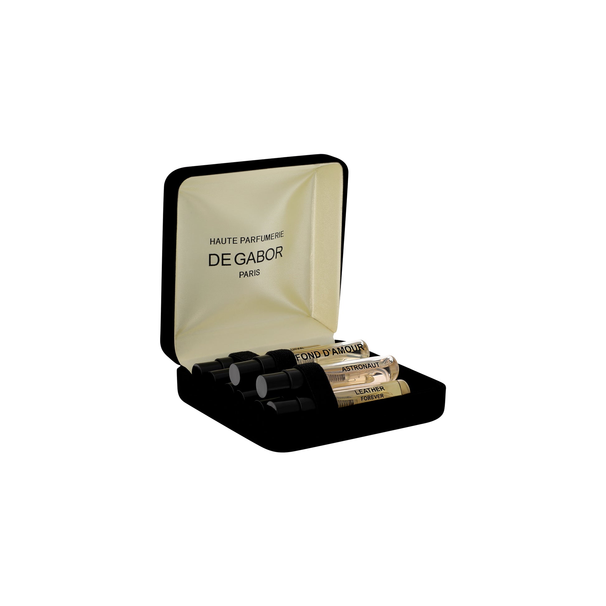 This discovery set brings together a curated selection of DE GABOR fragrances in 2,5 ml bottles. The box, lined with champagne-toned satin and velvet exterior, elegantly protects each vial. It is the perfect entryway to discover the brand's olfactory signature or to accompany you on your travels.